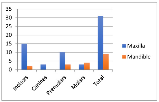 Nineteen implants were inserted using flap surgery (F), and 21 were inserted using flapless (FL) surgery. Thirty-one implants (72.5%) were inserted in the upper jaw, and nine (27.5%) in the lower jaw. Five patients with six implants smoked at the point in time the re-evaluation of the implants was carried out. Details on implant locations are specified in Table 1 and Figure 1.