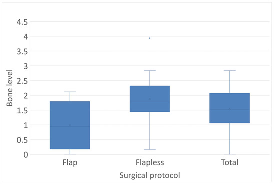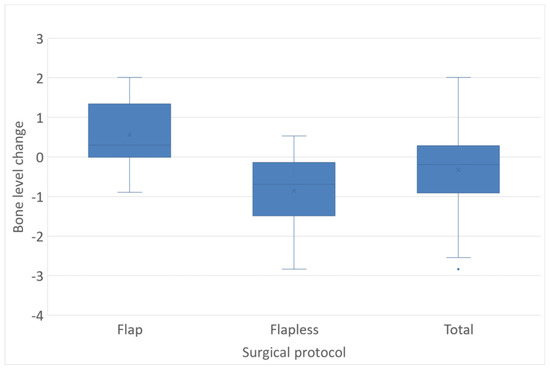 Boxplot showing the median bone level change in mm in the flap- (n = 19) and flapless (n = 21) groups, as well as for the combined group after 10–12 years. An increase in mm (above zero) suggests an increase in distance between the bone level to the implant-abutment interface, indicative of bone loss. There is a statistically significant difference between both groups (p = 0.003).