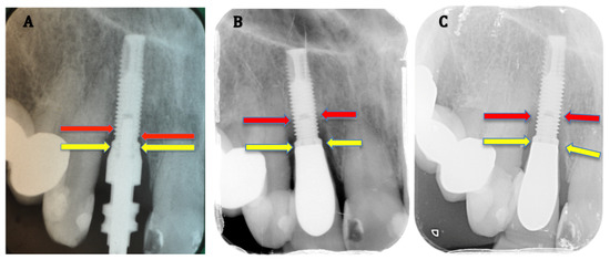 Peri-apical radiographs of an implant (corresponding to the outlier in Figure 2), which represents the worst radiographical image of bone loss in this study, at the following time points: (A) 6 months after implant placement, (B) 7 years 11 months in function (C) 11.5 years in function. The yellow arrow indicates the reference point from where the bone level was determined. The bone level is indicated by the red arrow.