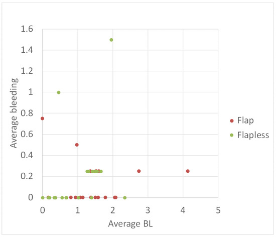 Scatter graph showing the correlation between Bleeding Index and bone loss for the whole group and surgical protocol.