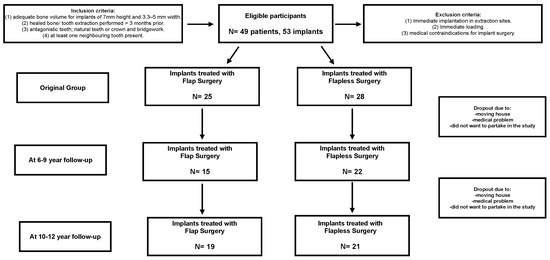Scheme showing the flow of patients and implants treated using the Flap or Flapless treatment protocol from the time of placement until the current follow-up, including the number of drop-outs per group at the time of recall.
