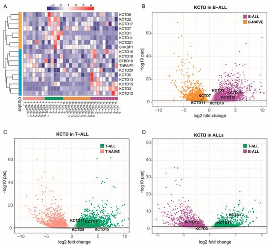 KCTD gene expression in childhood ALL. (A) Heat-map shows KCTD gene expression trends in the distinct conditions. Expression values, normalized by row, are indicated with a red (highest expression) to blue (lowest) graded color. Each cluster comprises the KCTDs of a particular condition, one ALL subtype, or the healthy counterparts. Volcano plot illustrating the transcriptome variations between B-ALL and B naïve cells (B), T-ALL and T naïve cells (C), and B-ALL and T-ALL (D). Each dot corresponds to a gene. Light grey dots indicate no significant variations (adjusted p-value > 0.05) and significant variations with a log2 (fold change) between 1 and −1. Dark grey dots highlight the position of deregulated KCTDs reported with text in the figure.