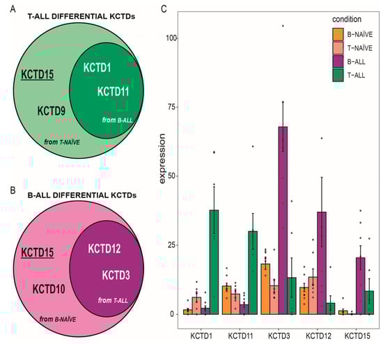 Differentially regulated KCTDs. (A) Significantly upregulated KCTDs in T-ALL compared with both B-ALL and healthy subjects. (B) Significantly upregulated KCTDs in B-ALL compared with both T-ALL and healthy subjects. (C) Gene expression levels of all the significantly differentially expressed KCTDs in all the examined healthy and pathological states. Expression value is expressed as normalized counts from RNA-seq data. Dots represent the expression value for each sample.