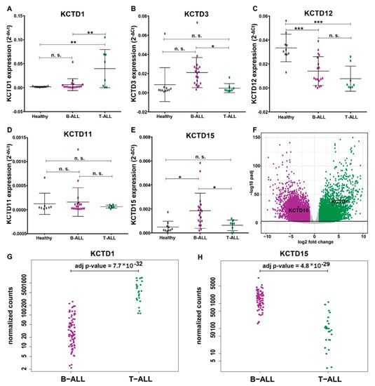 RT-PCR validations on larger cohorts of patients. Expression level of selected KCTD proteins (A) = KCTD1, (B) = KCTD3, (C) = KCTD12, (D) = KCTD11, (E) = KCTD15 in mononuclear cells from healthy cord blood samples and leukemic cells derived from pediatric B-ALL and T-ALL patients. Expression levels were plotted according to the relative expression (2-ΔCt method) measured in PBMC from healthy donors (n = 10, grey circles), in bone marrow cells from diagnosed pediatric B-ALL patients (B-ALL, n = 19, purple circles), and in pediatric T-ALL patients (T-ALL, n = 8, green circles). * p < 0.05, ** p < 0.01, *** p < 0.001; Mann–Whitney t-test. n.s. = not significative. (F) Volcano plot illustrating the transcriptome variations between B-ALL and T-ALL using the St. Jude Children’s Research Hospital Database. B-ALL=Purple dots; T-ALL= Green dots. In silico analyses of KCTD1 (G) and KCTD15 (H) expression levels using data from the St. Jude Children’s Research Hospital database. B-ALL patients: n = 99, median age: 15 years. T-ALL patients: n = 28, median age: 9 years.