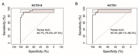 ROC curve of the sensitivity vs. specificity of KCTD15 (A) and KCTD 1 (B) in B-ALL and T-ALL patients, respectively, reported in the St. Jude Children’s Research Hospital Database.