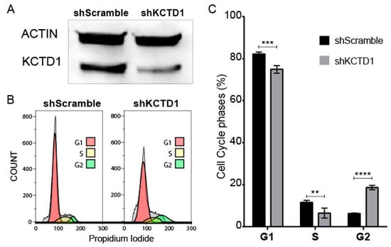 We decided to silence KCTD1 in a T-ALL cell line model, the Jurkat cell line, to gain insight into the putative functional role that this protein may have in T-ALL patho-physiology. Using shRNA technology, we were able to effectively reduce KCTD1 levels in Jurkat cells after 96 h from transfection (Figure 5A). The evident reduction of KCTD1 resulted in a change in the cell cycle of the silenced Jurkat cells. Indeed, as observed in Figure 5B,C and Supplementary Figure S2, shKCTD1 Jurkat cells show a significant reduction in G1 and S phases with a corresponding increase in the G2 phase compared with control sh-treated cells. However, the effect of KCTD1 silencing on cell proliferation needs to be experimentally confirmed. These data associate the activity of KCTD1 with an efficient proliferation of cancer T cells, highlighting this protein as a promising therapeutic target.