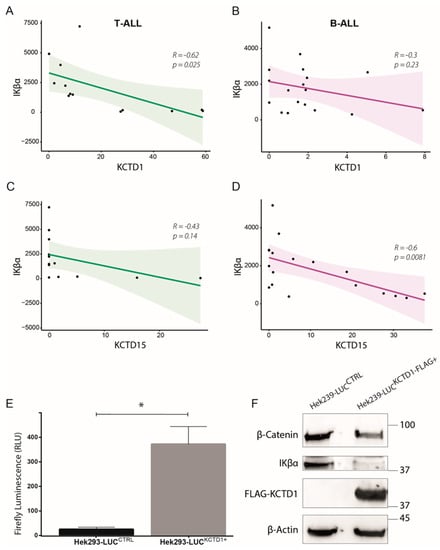 Pearson correlation of gene expression levels expressed in normalized counts between KCTD1 and IKβα in T-ALL (A), R = −0.62; p-value = 0.025, B-ALL (B), R = −0.3; p-value = 0.23, patients and between KCTD15 and IKβα in T-ALL (C), R = −0.43; p-value = 0.14 and B-ALL (D), R = −0.6; p-value = 0.0081, patients. B. (E) Bar-plot diagram of firefly luciferase signal in NF-κB reporter (Luc)-HEK293 control (black bars) and in NF-κB reporter (Luc)-HEK293 over-expressing KCTD1 (grey bars). Errors represent ± SD of three independent experiments. * p-value < 0.05, Mann–Whitney t-test. β-Catenin, IKβα, KCTD1-FLAG, and β-Actin western blot analyses of NF-κB reporter (Luc)-Hek293 cell line over-expressing KCTD1-FLAG in comparison with control cell line (F).