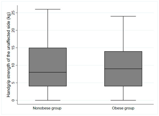 During the study period, 298 patients were transferred to the rehabilitation units. Ultimately, 111 patients aged ≥65 years who had possible sarcopenia were included in the analysis. Patient characteristics are summarized in Table 1 according to the presence or absence of obesity with possible sarcopenia. The proportion of patients with obesity was 32.4% (n = 36). The mean ages of the non-obese and obese groups were 76.9 ± 7.1 and 77.3 ± 6.0 years, respectively. Male participants comprised 37.3% (n = 28) and 36.1% (n = 13) of the non-obese and obese groups, respectively. No differences in demographic characteristics were found between the obese and non-obese groups; however, the proportion of premorbid disabilities was higher in patients with obesity than in patients without obesity (p = 0.031). The median BMI was 23.3 [20.2–25.0] kg/m2 for the non-obese group and 24.7 [22.8–27.2] kg/m2 for the obese group. Although there was a statistically significant difference between the two groups (p = 0.001), the median BMI values did not show a marked difference. Regarding the BIA measurements, the difference in mean fat mass between the two groups was larger than the difference in median BMI. The mean fat mass was 20 ± 10% for the non-obese group and 40 ± 10% for the obese group (p < 0.001). The height-adjusted ASM was higher in the non-obese group than in the obese group (p = 0.006). There were no significant differences between groups in the initial functional scores. At the baseline assessment, the median value of HGS on the unaffected side in the non-obese group was 8.0 [4.0–15.0] kg, which was not significantly different from that of the obese group (9.0 [4.0–14.0] kg; Figure 1). However, the BDI score was higher in the non-obese group than in the obese group (p = 0.02).