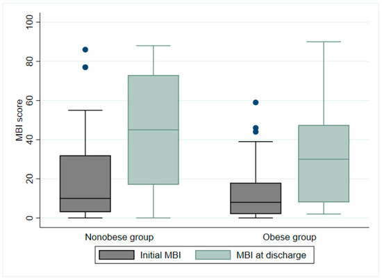 Modified Barthel index (MBI) scores of nonobese and obese groups at time of discharge following 4 weeks of inpatient rehabilitation (p = 0.006). Blue dots represent outliers.