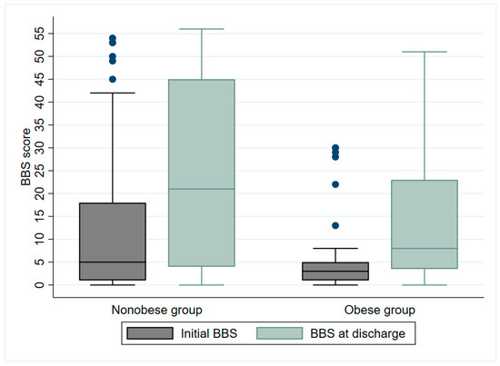At the time of discharge, the median MBI score improved from 10 to 45 points for the non-obese group and from 8 to 30 points for the obese group (Figure 2). The median BBS score improved from 5 to 21 points for the non-obese group and from 3 to 8 points for the obese group (Figure 3). Although there were no significant differences in ADL performance or balance ability between groups at the time of the initial evaluation, there were significant differences in both MBI and BBS scores at discharge, depending on the presence or absence of obesity (non-obese group: MBI: p = 0.006; BBS score: p = 0.04) after approximately 4 weeks of inpatient rehabilitation.