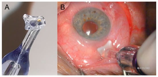 All interventions were performed by the same surgeon (KG) in the operating theater. For pain management, topical anesthesia was applied using tetracaine drops and subconjunctival mepivacaine 1% injection, accompanied by systemic sedation. While the segments at 3 h and 9 h positions were spared, the superior and inferior perilimbal circumferences were treated under direct visual control using the MP3 probe (CycloG6 Laser, Iridex, Mountain View, CA, USA). Both the superior and the inferior hemicircles were treated for 90 s and with 3 Watts of energy at an application velocity of app. 20 s. Photographs of the MP3 laser probe, as well as a treatment procedure in progress, are shown in Figure 1.