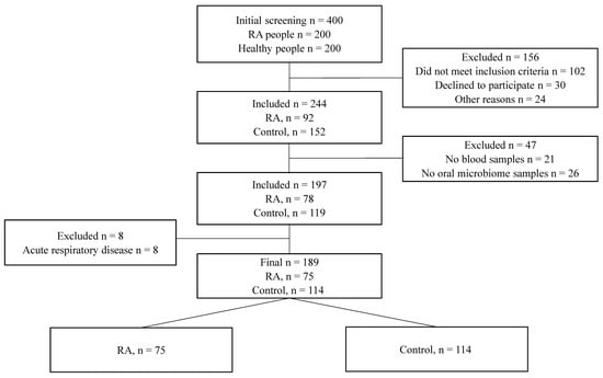 Patient recruitment was conducted from outpatients No. 10 and No. 12 of Astana city, Kazakhstan, and via an official invitation on social networks in the period from September 2019 to December 2021. Overall, 189 individuals, including 75 RA patients and 114 healthy controls, were included in the study (Figure 1). Considering the inclusion criteria (established RA diagnosis with a duration of more than 1 year) and exclusion criteria (pregnancy, lactation, oncology, comorbid conditions, decompensated chronic diseases, taking antibiotics and probiotics 3 months before the study), healthy controls lacked heredity for autoimmune diseases, including RA. Anamnestic and examination data were recorded in the individual cards with the assignment of an individual code. Examination of the bone and joint system was carried out according to generally accepted rules. The tender joint number (TJC) and swollen joint number (SJC) were counted. The symptoms of transverse compression of the hands and feet and the strength of compression of the hands were evaluated. The deformities and disfigurations were recorded. Data on extra-articular manifestations and the presence of complications were recorded. The pain assessment was carried out using a visual analog scale, and the overall average score was registered. The assessment of disease activity was carried out according to the disease activity score (DAS28) disease activity index. Active RA was defined as DAS28 ≥2.6, and RA disease in remission was defined as DAS28 <2.6 [14]. The X-ray stage was set according to the X-ray images of patients over the past year.