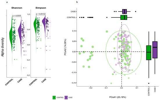 Microbial biodiversity of the oral cavity. (a) The 𝛼-diversity distribution among incident RA patients and healthy controls (case); (b) β-diversity of the oral microbiome in RA patients and cases. The points with green illumination belong to the samples of the control group, and the purple points belong to the RA group.