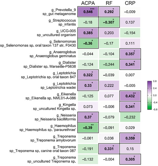 Association between oral bacterial abundance and systemic signature in patients with RA. Correlation between the relative abundance of certain taxa and concentrations of ACPA and RF and C-reactive protein (CRP) in serum. The color scale represents the magnitude of the correlation. Purple highlights indicate a positive correlation; green highlights indicate a negative correlation. * p < 0.05, ** p < 0.01, *** p < 0.001.