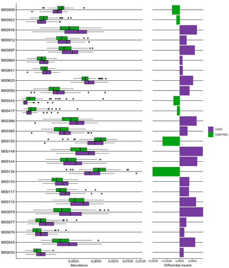 In order to investigate the functional role of the oral microbiome in RA, we used the PICRUSt2 tool to perform functional prediction based on marker sequences of the 16S rRNA gene [21]. This analysis identified 6119 KEGG orthologs (KOs) (Supplemental Table S2) and 457 modules (Supplemental Table S3), which were then filtered to identify truly different KEGG modules (fraction of module at least 0.1% of total number of modules, difference between modules at least 10%, FDR = 0.1). As a result, we found that 25 KG modules were significantly different in the RA group compared to the healthy control group, with 19 being increased and 6 being decreased (Figure 5).