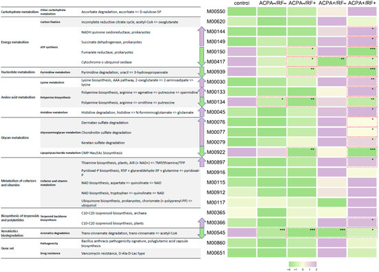 Differential patterns predicted by KEGG modules in combinations of anticitrullinated protein antibodies and rheumatoid factor. The abundance of predicted functional modules is shown on the basis of color illumination, where green indicates a decrease in the function parameter, and purple indicates an increase. Trends toward an increase or decrease in the abundance of predicted functions are shown by highlighted arrows. * p < 0.05, ** p < 0.01, *** p < 0.001. The ACPA+/RF− group includes only three samples, so statistical indicators can be both representative and distort the picture associated with characteristic changes.