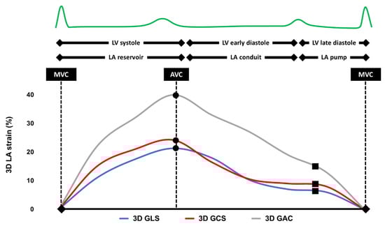 Typical example of a three-dimensional left atrial strain analysis. LV, left ventricle; LA, left atrium; MVC, mitral valve closure; AVC, aortic valve closure; 3D, three-dimensional; GLS, global longitudinal strain; GCS, global circumferential strain; and GAC, global area change.