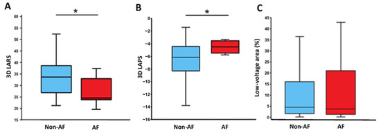 Left atrial reservoir strain (LARS, panel (A)), left atrial pump strain (LAPS, panel (B)), low-voltage area (LVA, panel (C)), and recurrence of atrial fibrillation (AF). 3D, three-dimensional; AF, patients with recurrence of atrial fibrillation; and Non-AF, patients without recurrence of atrial fibrillation. Asterisk denotes a significant difference (p < 0.05).