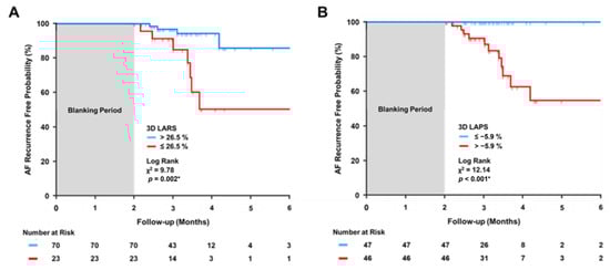 When these cut-off values were used for Kaplan–Meier analyses, patients with 3D LARS ≤ 26.5% or 3D LAPS > −5.9% showed a significantly higher probability of AF recurrence during the first six month of follow-up after the blanking period (Log Rank X2 = 9.78, p = 0.002 and X2 = 12.14, p < 0.001, Figure 4A and Figure 4B, respectively).