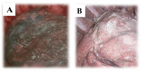 Thoracoscopic view of the two coverage materials: (A) PGA, (B) ORC. ORC—oxidized regenerated cellulose; PGA—polyglycolic acid.