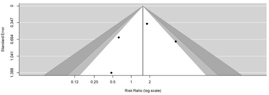A systematic review of three studies (Table 3) retrieved through a PubMed/Medline search, comparing the two coverage materials, was conducted. The follow-up period and the number of participants varied. A meta-analysis of postoperative recurrence, performed after including our study, found no significant difference between the two coverage materials (RR: 1.62, 95% CI: 0.59–4.42, p = 0.08, I2: 56%) (Figure 2). The funnel plot was balanced in terms of publication bias (Figure 3).
