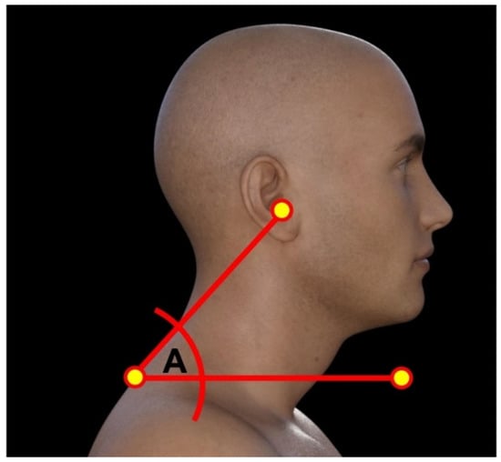 Measurement of the craniovertebral angle (CVA). Two markers are utilized and placed at the level of the C7 spinous process and the tragus of the ear; then a line is constructed connecting these two points. Finally, a horizontal line is drawn using the C7 marker as the reference, and the CVA is measured as angle A between the two lines [36,37].