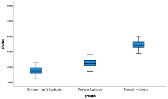 Box and whisker plots of the craniovertebral angle measured in degrees (CVA°) in the postural kyphosis groups (CVA, 44° ± 4), the Scheuermann’s kyphosis group (CVA, 38° ± 4.5), and the normal kyphosis (CVA, 53° ± 4) groups.