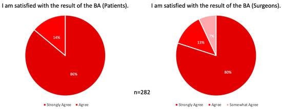 General satisfaction with results 1 year postoperatively. (Left) Patients and (Right) surgeons showed 100% overall satisfaction with the postoperative results. BA, breast augmentation.