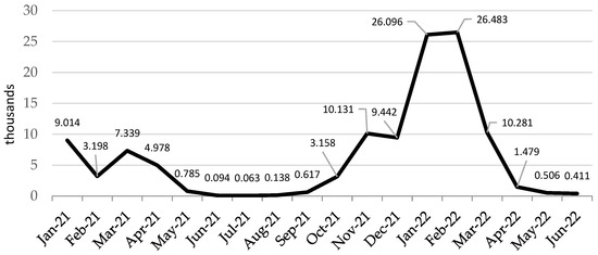 Dynamics of changes in the total number of infected healthcare workers in individual months of the study period (1 January 2021–30 June 2022) in Poland.