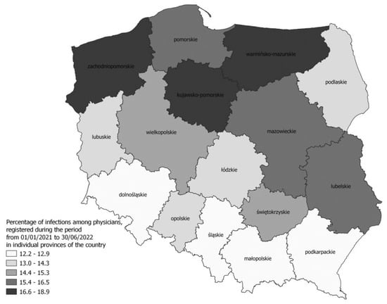 Percentage of infections among physicians, registered during the period from 1 January 2021 to 30 June 2022 in individual provinces of the country.