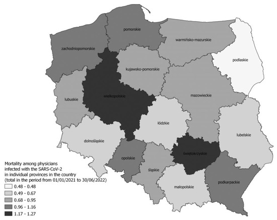 Mortality among physicians infected with the SARS-CoV-2 in individual provinces in the country (total in the period from 1 January 2021 to 30 June 2022).