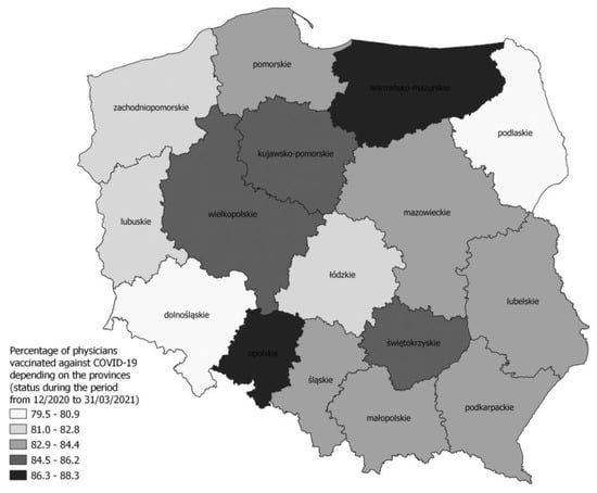 The results regarding the vaccination status of HCWs against COVID-19 indicate that during the period from December 2020 to March 2021, medical doctors were the group with the highest percentage of vaccination (83.63%) and the lowest were physiotherapists (38.2%). Detailed data in this regard, including voivodeships, is presented in Table 3. In turn, Figure 4 presents regional differences in the percentage of vaccinated doctors.
