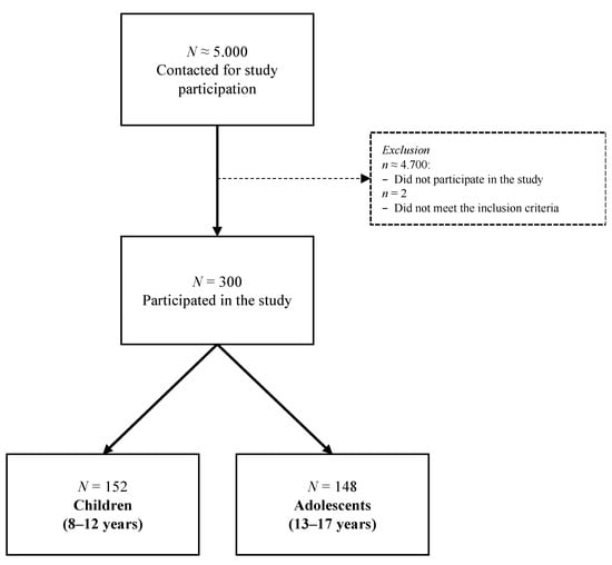 Overall, 152 children (8–12 years) and 148 adolescents (13–17) were included in the final study sample. Most participants were interviewed in a face-to-face offline setting (8–12 years: n = 113; 13–17 years: n = 111) and the remaining were tested face-to-face online (8–12 years: n = 39; 13–17 years: n = 37). Parents filled in respective proxy paper–pencil forms. For an overview on sample attrition, see Figure 1.