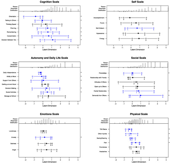 Person–item maps for the QOLIBRI-KID/ADO scales. Upper parts of the respective scales’ graphs depict person parameter () distribution. Lower parts present item thresholds (unfilled circles) and item location parameters or average item parameters (filled circles). Blue-colored items additionally marked with an asterisk (*) indicate thresholds disorder. The order of the items corresponds to their position on the latent trait dimension (from lowest to highest).