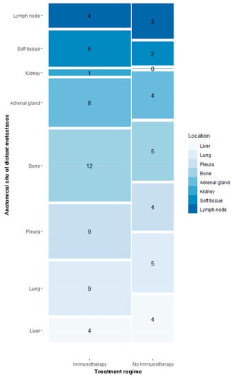 Number of segmented distant metastases per anatomical site in patients treated with immunotherapy vs. no immunotherapy.