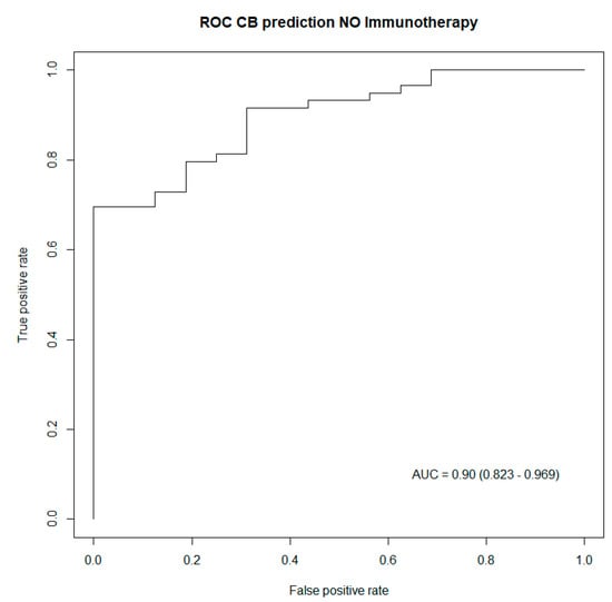 In order to validate these results, a concordance test, as well as an LR test, were performed to assess the performance of these two prediction models. Both tests indicated better performances of the generated models for patients treated with immunotherapy, as captured in Table 4. Subsequently, ROC curves were also drawn up to illustrate the predictive power of the generated prediction models, including all predictive biomarkers for clinical benefit listed in Table 4. Both ROC curves captured excellent performances from both prediction models, respectively, in patients treated with immunotherapy, as well as in patients having no immunotherapy treatment Figure 2 and Figure 3.