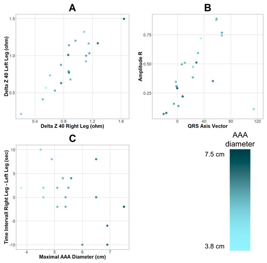 Apart from prediction, association analysis of variables and maximum AAA diameter was conducted. Filtering based on correlation coefficients of the diameter measurements taken from the CTA studies and parameters resulted in six variables based on r > 0.45 or < −0.45. (Supplement Table S2) Qualitative analysis revealed a positive association between AAA diameter and signals detected in the lower extremities (Figure 2A) as well as negative associations regarding cardiac bioimpedance variables (Figure 2B). Additionally, it was observed that with an increasing AAA diameter, the variance of the time interval between signal detection in the lower extremities simultaneously increased (Figure 2C).