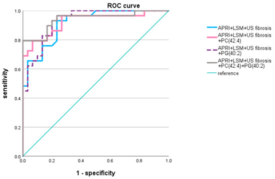 | APRI + LSM + US fibrosis score + PC (42:4) | 79.3 | 93.3 | 86.2 | 80 |