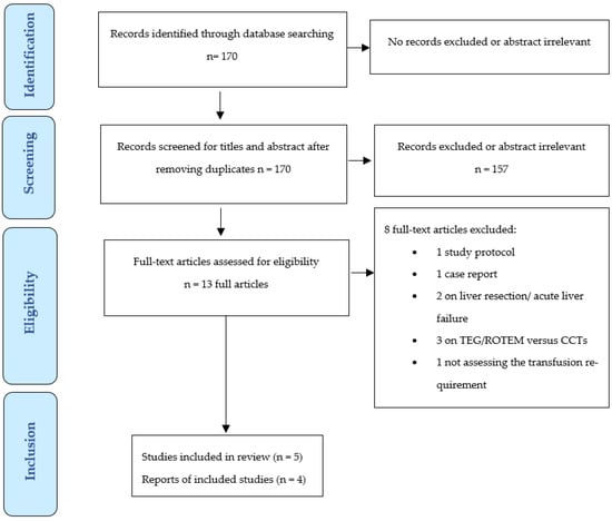 Based on the initial search results, 170 titles and abstracts were examined. No additional publication was retrieved by hand search of the references. 157 reports were rejected because they were not relevant to our study focus. Of the remaining 13 articles, 8 did not meet the inclusion criteria: 1 study protocol, 1 case report, 2 on liver resection/acute liver failure, 3 on viscoelastic versus conventional coagulation tests, and 1 not assessing transfusion requirement. In the end, five publications were reviewed, four of which were included in the meta-analysis (see Figure 1). One study was excluded from the quantitative analysis because PCC was only administered in a sub-population of LT recipients to reverse anti-vitamin k agents prior to LT [34].