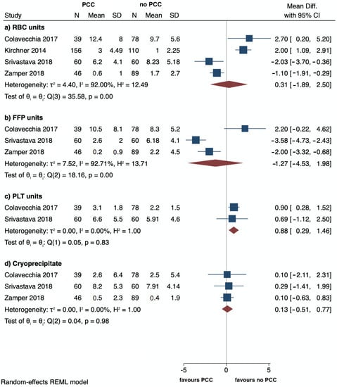 Figure 2. Forest plots reporting transfused units of RBCs, FFP, PLTs, and cryoprecipitate, respectively, (ad) in PCC versus no PCC groups. The effect size is calculated as a mean difference (MD) and corresponding 95% confidence interval (95%CI) [4,5,6,7].