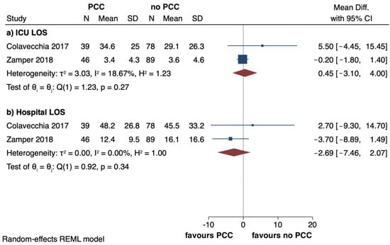 Figure 4. Forest plots reporting intensive care unit (ICU) and hospital length of stay (LOS), respectively, (a,b) in PCC versus no PCC groups. The effect size is calculated as a mean difference (MD) and corresponding 95% confidence interval (95%CI) [5,7].