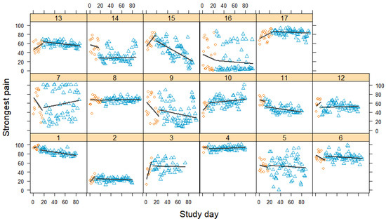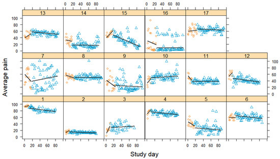 Figure 2 shows the individual changes in average pain levels over time. As pain should decrease over time, a downward trend would represent an effect in the expected direction. Measurements were taken daily so that the baseline phase comprised a maximum of 10, 17, or 24 measurement points. The treatment phase comprised a maximum of 60 measurement points.