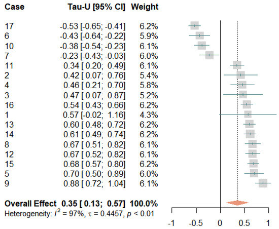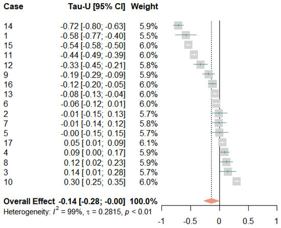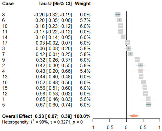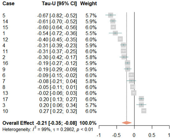 Figure 7 presents the results of the meta-analysis. With a mean Tau-U of 0.35 [0.13, 0.57], the overall effect showed a significant medium-sized improvement in the pain self-efficacy rating. Twelve effects yielded significant results, with moderate to very large effect sizes in the expected direction. Four effects were significantly negative, and one effect was non-significant. The negative effects were found for two participants who also experienced increased pain (cases 10 and 17), plus two participants whose pain levels did not change much (cases 6 and 7). A very large amount of variation was not accounted for (I2 = 97% and τ = 0.45), suggesting strong variations in the responses to the treatment.