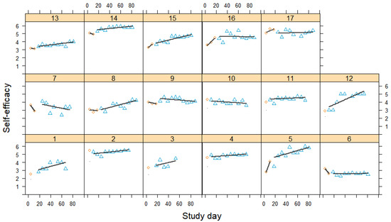 Self-efficacy scores during baseline and treatment for each participant, with regression lines for each phase. Orange circles represent baseline measurements, blue triangles treatment measurements, black lines regression lines, and numerals labels indicate each case.