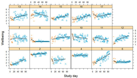 Wellbeing scores during baseline and treatment for each participant, with regression lines for each phase. Orange circles represent baseline measurements, blue triangles treatment measurements, black lines regression lines, and numerals labels indicate each case.