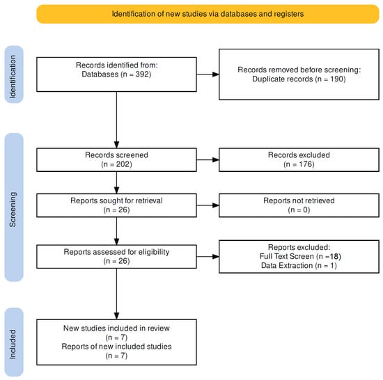From the previous systematic literature review by Bursröm et al., one article fulfilled our eligibility criteria [18]. From the new search time period of 27 November 2020 to 1 May 2023, 392 publications were identified. With Mendeley Desktop 1.19.8 software [19] 190 duplicates were removed, and 202 records were screened by title and abstract. During this screening, 176 articles were excluded, as those were not eligible for inclusion criteria. The full-text review was performed on the remaining 26 papers, where 19 publications were excluded, as those did not contain valid clinical outcome data on live patients. Altogether, 7 articles were included in the analyses. Figure 1 contains a PRISMA flow diagram about the search and screening (Figure 2) [17].
