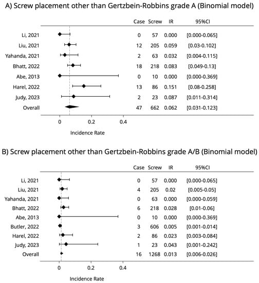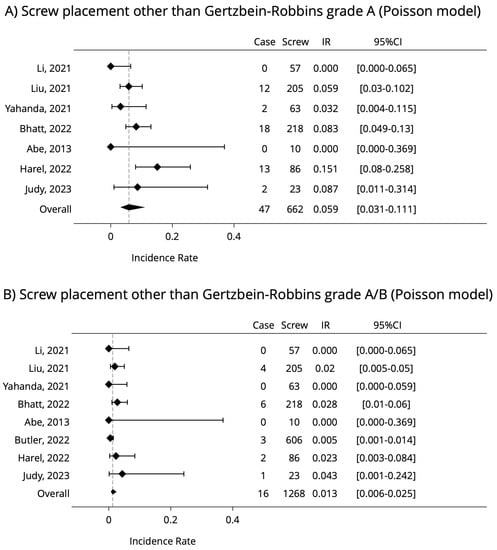 As there were no complications described in either of the investigated articles, a meta-analysis could not be performed. For further analysis, a multi-level Poisson model was used for the hypothesis, which measures and explains the incidence rate of “screw error odds” for every single screw insertion [31]. The confidence intervals were calculated with the exact Poisson method [32]. The examination was made in two scenarios, highlighting only GRS A class and GRS A and B rates together, as those are still clinically completely acceptable. Figure 3 contains the results of the analysis.