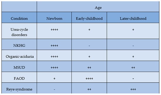 Causes of metabolic acute encephalopathy to be considered at various ages [2]. Abbreviations: NKHG: nonketotic hyperglycinemia; MSUD: maple syrup urine disease; FAOD: fatty acid oxidation disorders; -: almost none, +: sometime, ++: often, +++: frequently, ++++: most frequently.