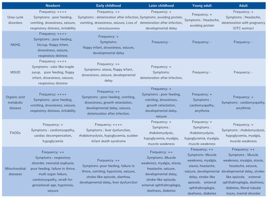 If inherited metabolic diseases are suspected by symptoms(Figure 4), first-line screening tests or examinations should be performed. These include testing for serum levels of glucose, ammonia, lactic acid, pyruvic acid, blood ketones, urinary ketones, free fatty acids, blood thiamine, and homocysteine and testing for arterial blood gas levels [12]. Lactic acid, pyruvic acid, serum ketones, and free fatty acids were measured simultaneously. Ketones are measured as acetoacetate in the urine and 3-hydroxybutyrate in the serum; the latter is important because it may diverge into pathological conditions. At the very least, urinary ketones must be measured. The differentiation of each disease is shown in Table 1.
