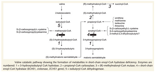 ECHS-1 deficiency is a mitochondrial disease that causes acute encephalopathy, and its recognition has increased in recent years. ECHS-1 deficiency is a mitochondrial disease with a broad spectrum of disease severity; however, it is often severe [37]. The symptoms of ECHS-1 deficiency include acute encephalopathy (Leigh or Leigh-like on MRI), deafness, dystonia, optic atrophy, cardiomyopathy, and lactic acidosis. ECHS-1 deficiency results in impaired amino acid metabolism, including valine and mitochondrial fatty acid beta-oxidation (Figure 8). The products of impaired valine metabolism [38], S-(2-carboxypropyl) cysteine and S-(2-carboxypropyl) cysteamine, are toxic, and the latter metabolite, 2-methyl-2,3-dihydroxybutyrate, can be identified using urine organic acid analysis and may help in diagnosis [39]. The metabolite 2-methyl-2,3-diydroxybuthyrate is very useful in screening for ECHS-1 and 3-hydroxyisobutyryl-CoA hydrolase deficiencies. Nevertheless, it can also be found in other disease groups; therefore, differentiation is necessary. Valine-restricted diets are being tested in many countries and evidence is being accumulated [40].